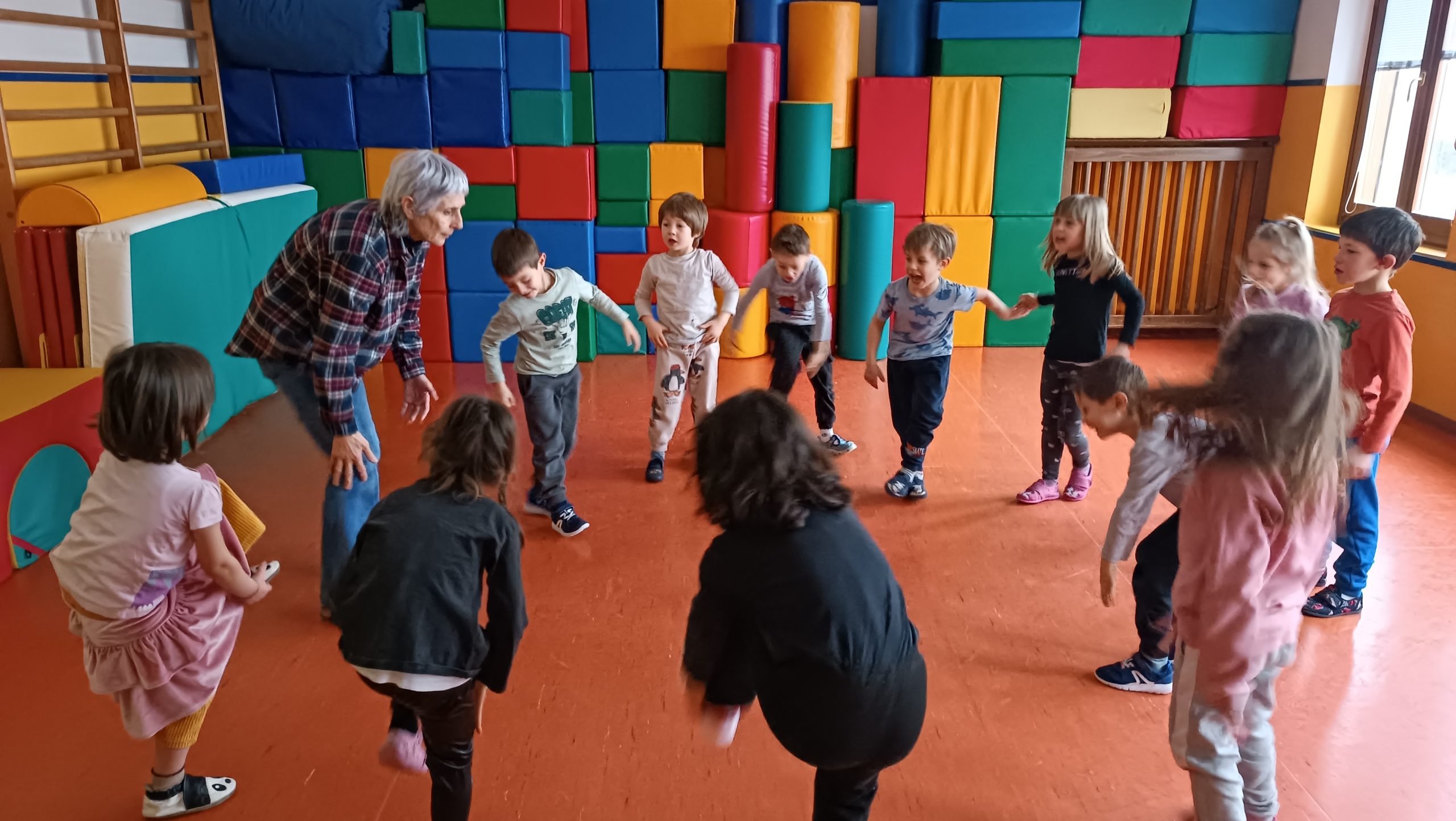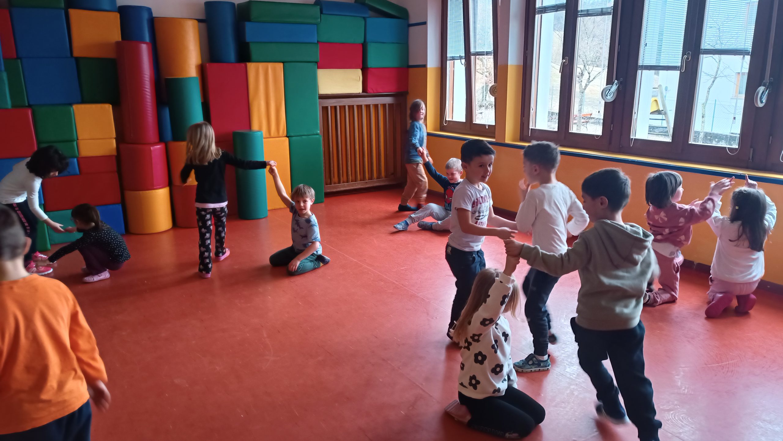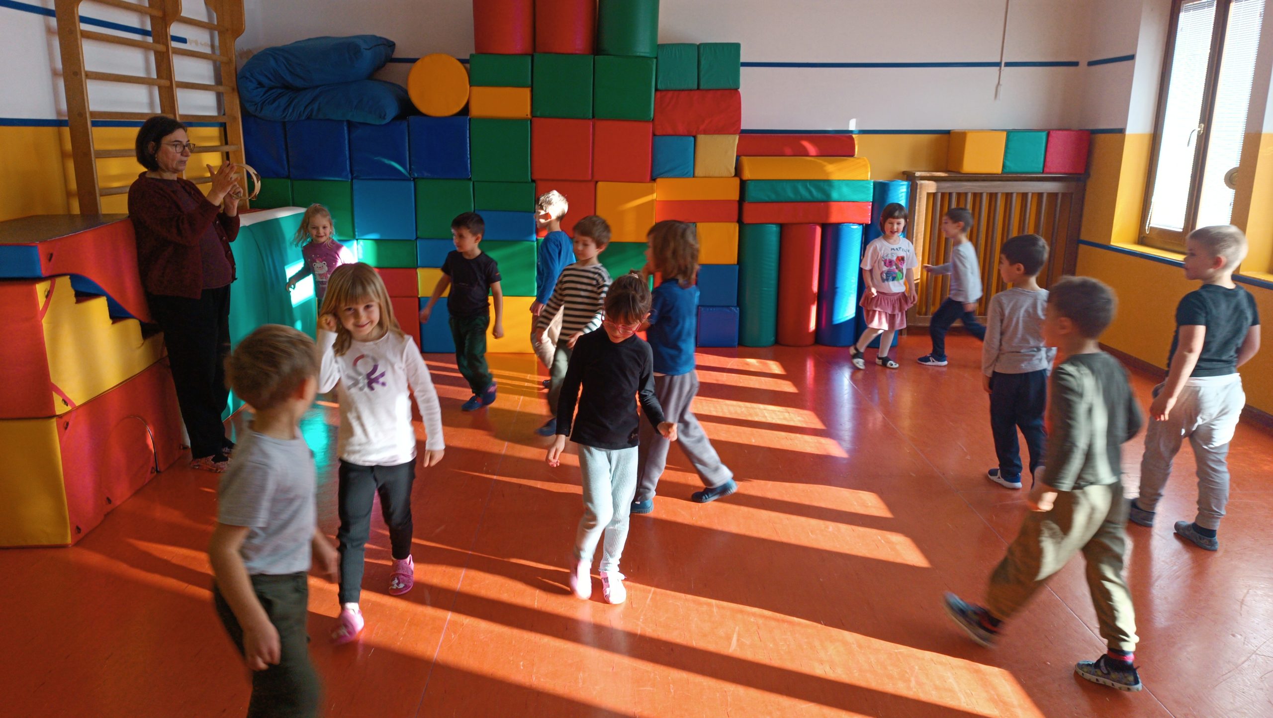 Con il mese di febbraio proseguono le attività dedicate ai vari aspetti dello schema corporeo.Questi sono sviluppati in vari ambiti: la motricità, non solo nella pratica psicomotoria, ma anche con la musica, attraverso giochi e percorsi, dentro e fuori scuola, e proposte che stimolino le diverse capacità percettive che aiutano i bambini a conoscere, riconoscere la propria identità corporea e ampliare le proprie abilità negli schemi motori di base.L’ascolto di suoni e musiche, permettono ai bambini, non solo di percepire e riprodurre strutture ritmiche, ma anche di coordinarsi ed esprimersi attraverso il corpo. Sono così facilitate le rappresentazioni dello schema corporeo, fermo e in movimento.I momenti di quiete e rilassamento, che in genere seguono alcune pratiche, favoriscono l’interiorizzazione di quanto appena vissuto, riportano il bambino ad un momento di calma, per beneficiare al meglio della pratica stessa. Questo permette inoltre il riconoscimento e il rispetto dei diversi tempi di ognuno di loro. La presenza di regole e indicazioni favoriscono la ricerca e l’acquisizione di comportamenti adatti, in cui si impara ad aspettare il proprio turno e a coordinare le proprie azioni motorie individualmente e in relazione al gruppo. Il 18 e 19 febbraio si svolgono le “Giornate dello Sport”: attraverso conversazioni comuni per raccontare quali sport conoscano o pratichino, con l’allestimento di semplici percorsi, giochi e gare tra loro.Queste diverse esperienze, interne ed esterne alla scuola, sono alla base anche di acquisizioni nell’ambito delle relazioni spaziali per l’individuazione di oggetti e persone nello spazio, oltre all’ampiamento delle competenze linguistiche e lessicali.A tal proposito, nell’ambito del progetto Moving School, i bambini dell’ultimo anno sono coinvolti nella predisposizione di semplici plastici, da realizzare con vario materiale sulla base dei loro desideri di attrezzatura/giochi per il giardino, immaginando la loro collocazione anche su una piantina.Questi plastici divengono poi lo spunto per interiorizzare le competenze di educazione civica con riferimento alla conoscenza delle figure istituzionali e al rispetto e valorizzazione del loro ambiente: i progetti realizzati vengono condivisi ai bambini dell’altra sezione, tramite l’uso di meet, coinvolgendo le figure del Sindaco e della Dirigente da loro rappresentati. Si cimentano così anche con l’uso delle tecnologie.Sempre per loro, proseguono i progetti fonologici (segmentazione sillabica, riconoscimento di suoni iniziali) e logico-matematica (raggruppare e ordinare secondo criteri dati, operare con numeri e simboli attraverso l’uso di dadi, carte ecc., riportare dati in semplici tabelle, muoversi nello spazio seguendo indicazioni).Ogni sezione provvede a cambiare l’allestimento e la dotazione di alcuni angoli, per promuovere nuovi stimoli ed interessi nei bambini. Continua fino alla fine di marzo il progetto di pratica psicomotoria con Enrico Bogo.