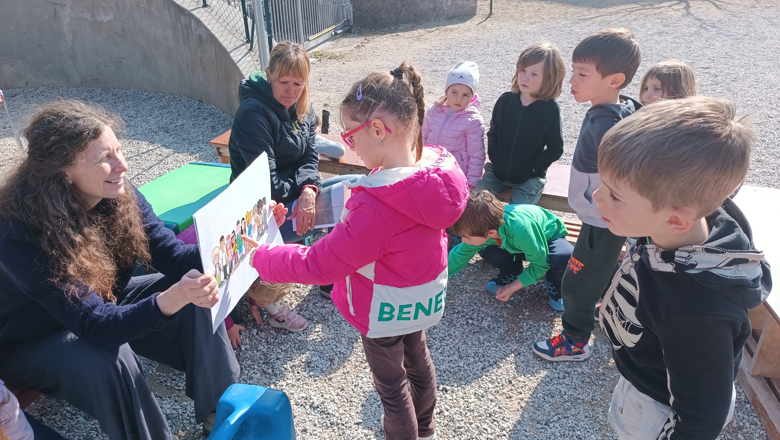 Il gruppo dei bambini dell’ultimo anno, di entrambe le scuole d’infanzia, cantano e animano insieme la canzone “Le parole”, preceduta da una breve registrazione con le riflessioni di alcuni sull’importanza delle parole stesse: come mezzo di conoscenza, di scambio, di relazione.